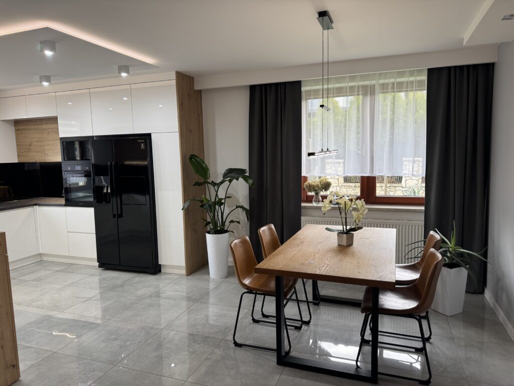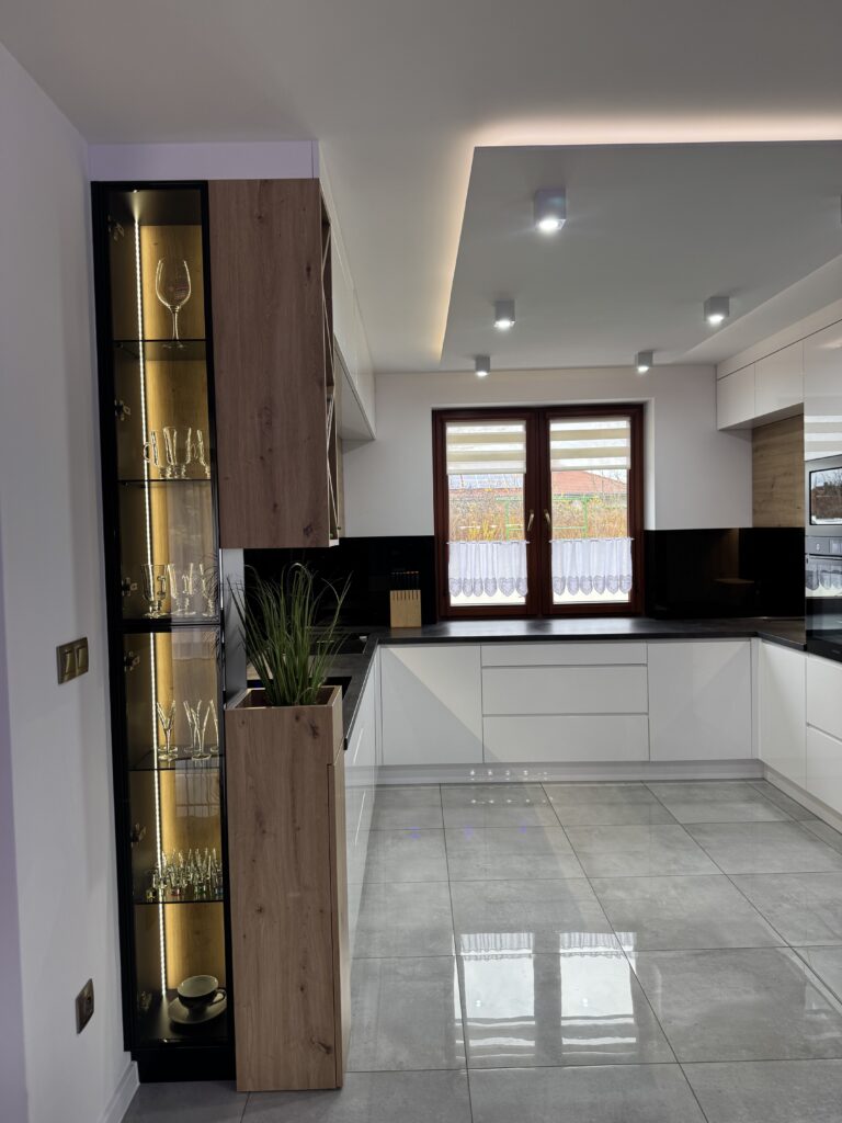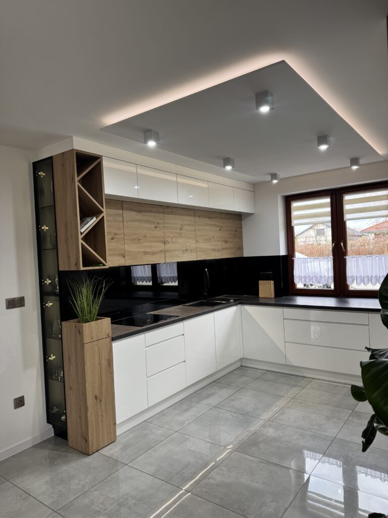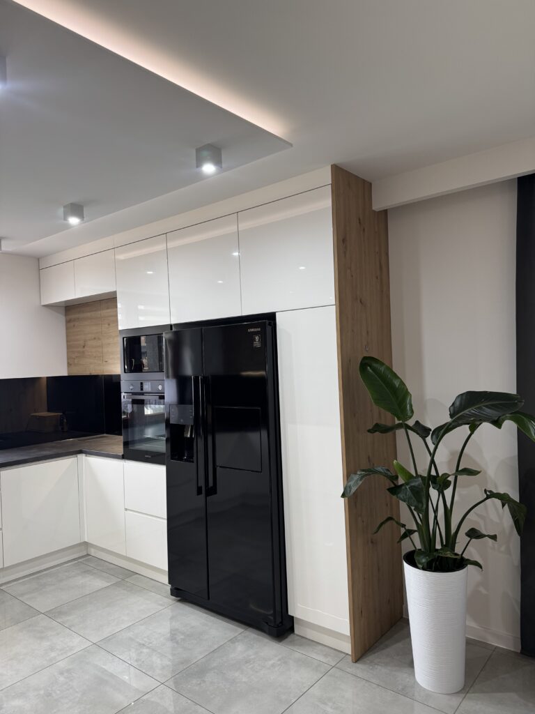 Połączenie bieli, drewna i czerni doskonale pokazuje, jak kuchnia może stać się eleganckim tłem dla codziennego życia, a nie dominującym elementem przestrzeni. To rozwiązanie ponadczasowe, które dobrze prezentuje się zarówno dziś, jak i za kilka lat.
