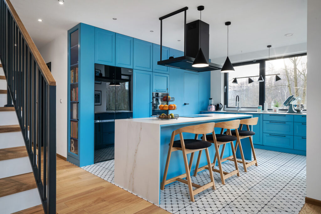 Nowoczesna kuchnia na wymiar z wyspą – odważny kolor, który definiuje całą przestrzeń