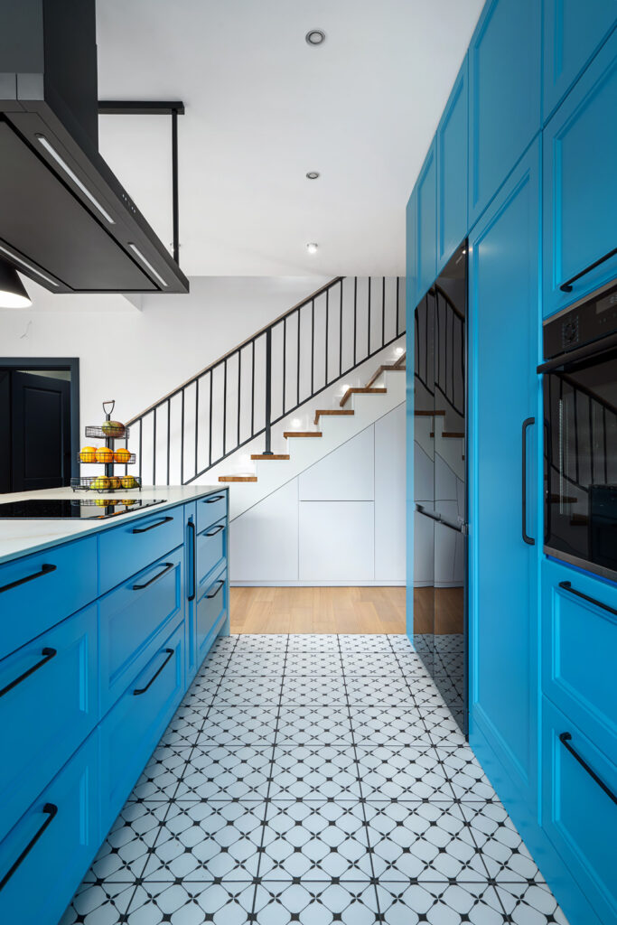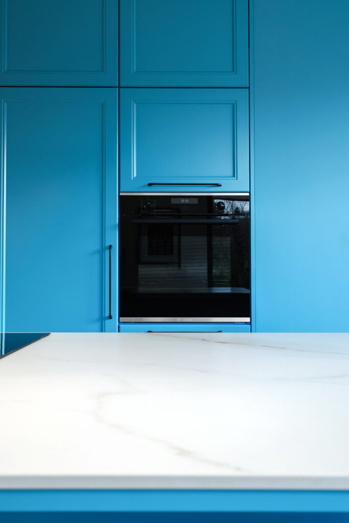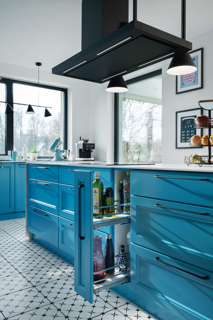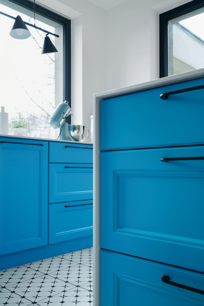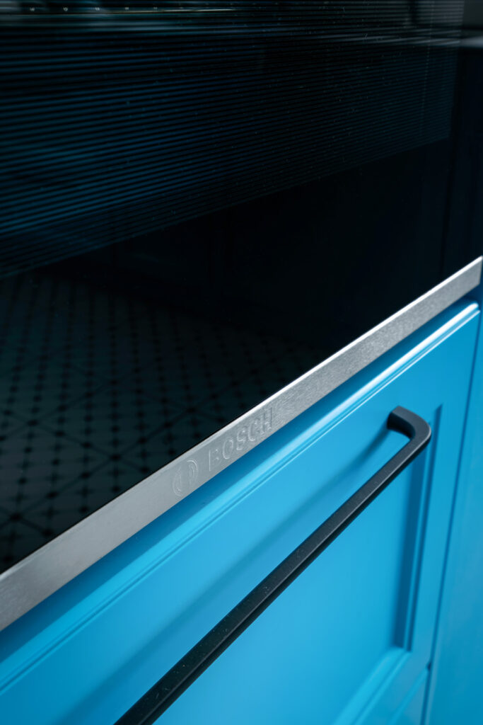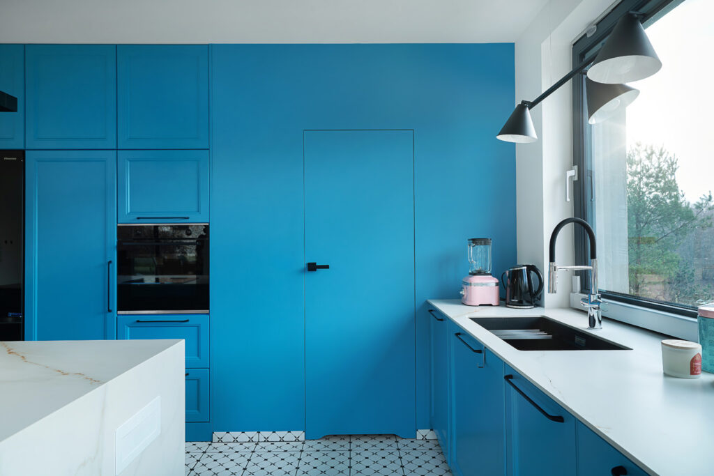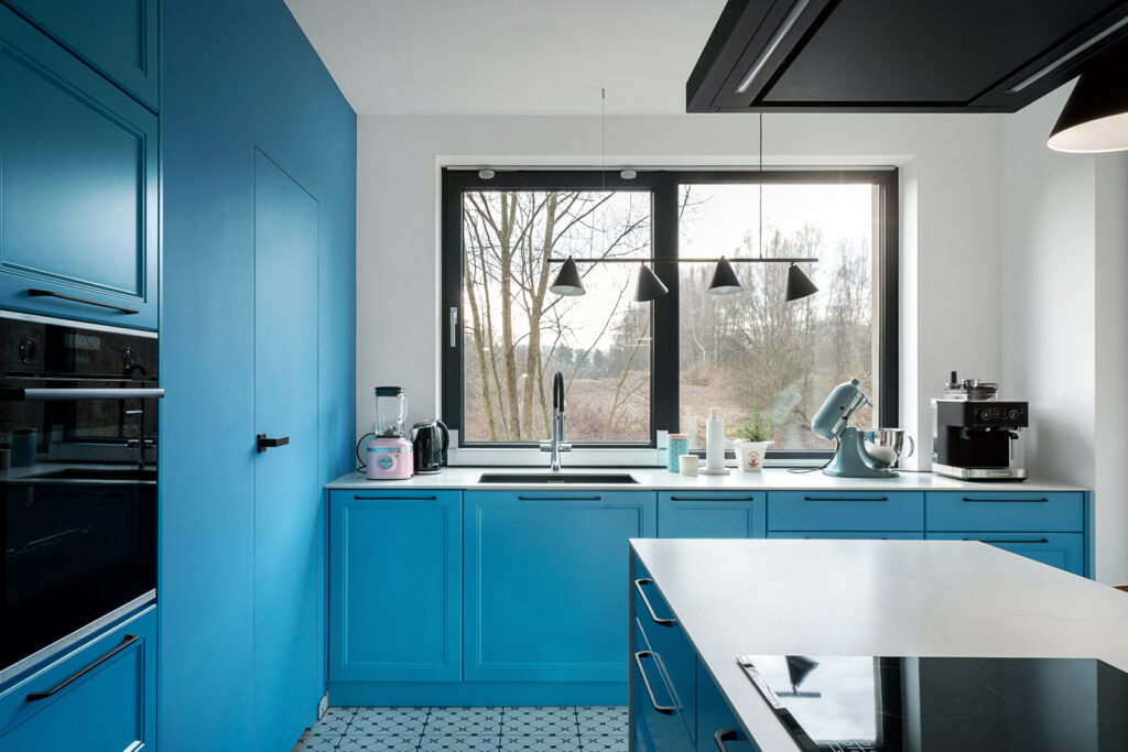W większości realizacji kuchni na wymiar kolor jest tłem. Bezpieczny, neutralny, łatwy do zaakceptowania. W tej kuchni jest dokładnie odwrotnie – to kolor buduje cały projekt. Niecodzienny, głęboki odcień niebieskiego nie został tu użyty jako dekoracja. To świadoma decyzja, która nadaje wnętrzu charakter i sprawia, że kuchnia przestaje być anonimowa. Nie próbuje się dopasować do wszystkiego. Ona nadaje ton całej przestrzeni.