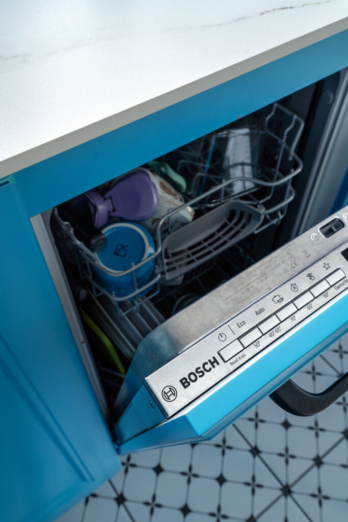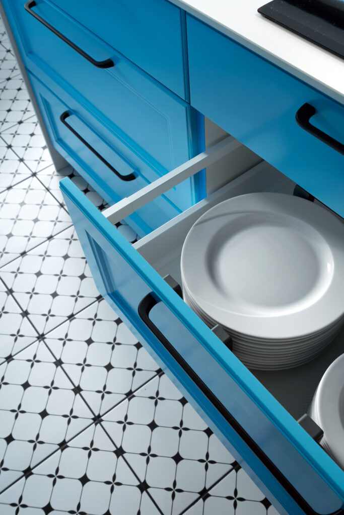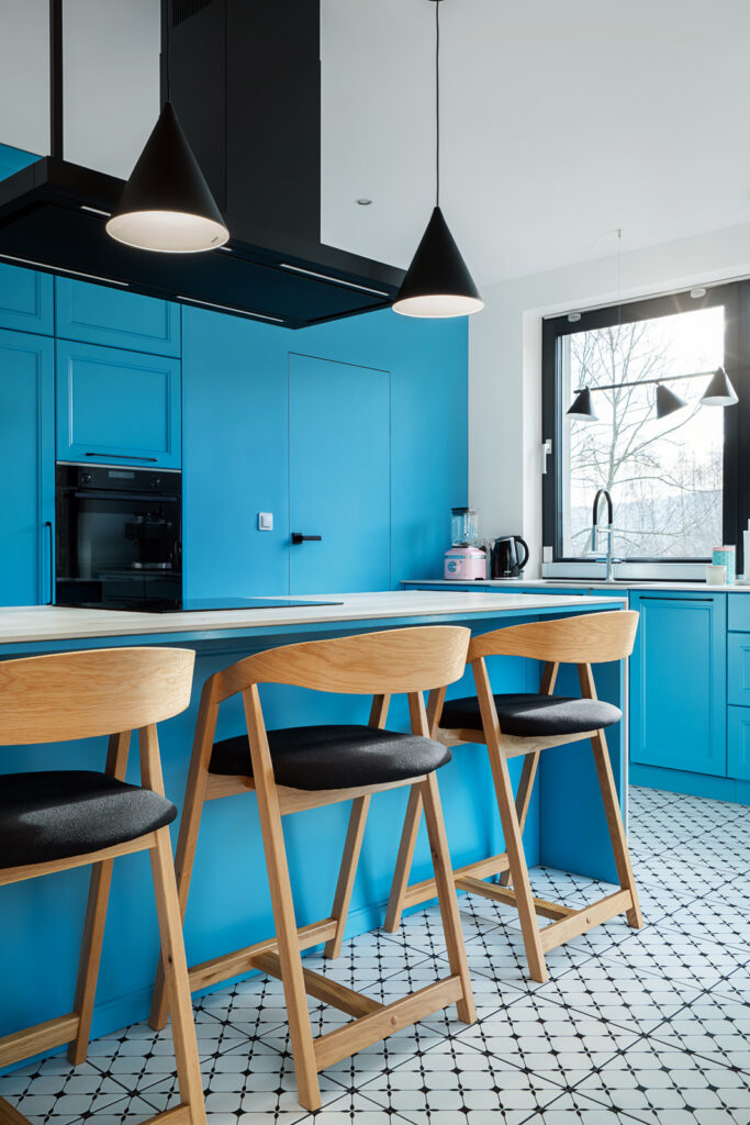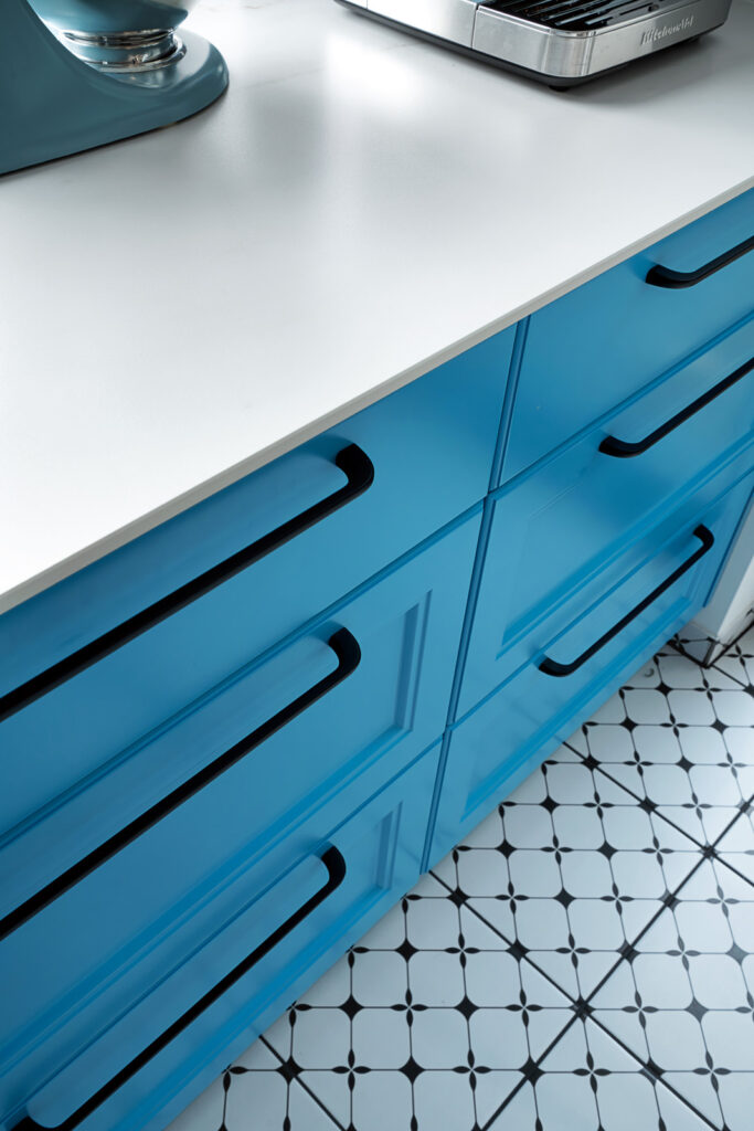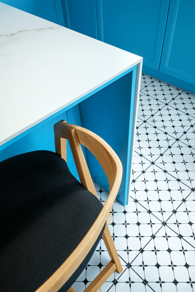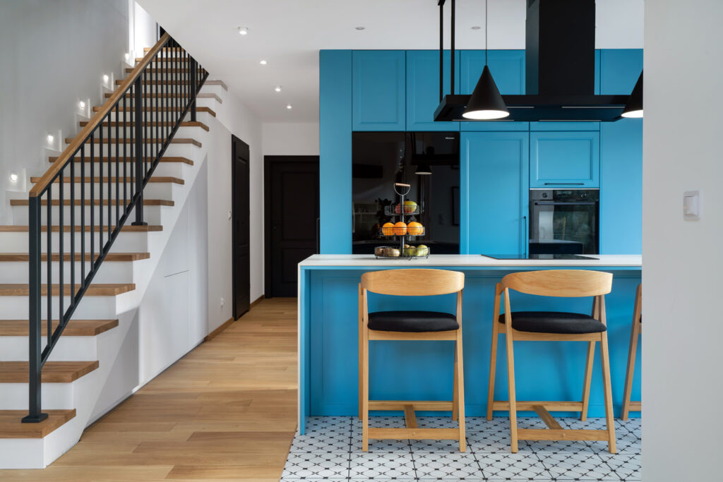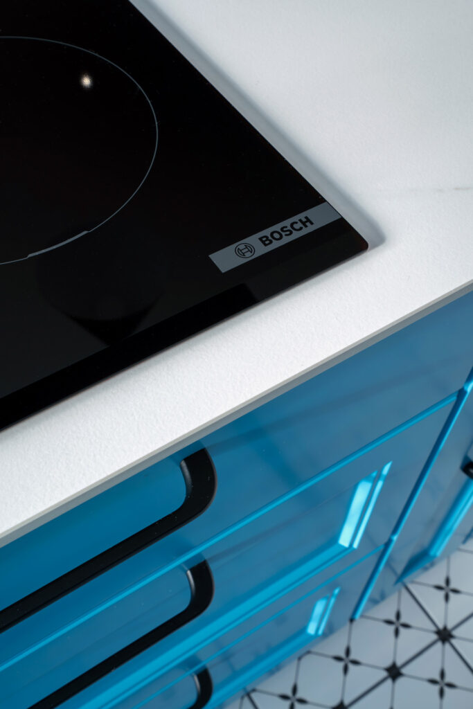 W większości realizacji kuchni na wymiar kolor jest tłem. Bezpieczny, neutralny, łatwy do zaakceptowania. W tej kuchni jest dokładnie odwrotnie – to kolor buduje cały projekt. Niecodzienny, głęboki odcień niebieskiego nie został tu użyty jako dekoracja. To świadoma decyzja, która nadaje wnętrzu charakter i sprawia, że kuchnia przestaje być anonimowa. Nie próbuje się dopasować do wszystkiego. Ona nadaje ton całej przestrzeni.